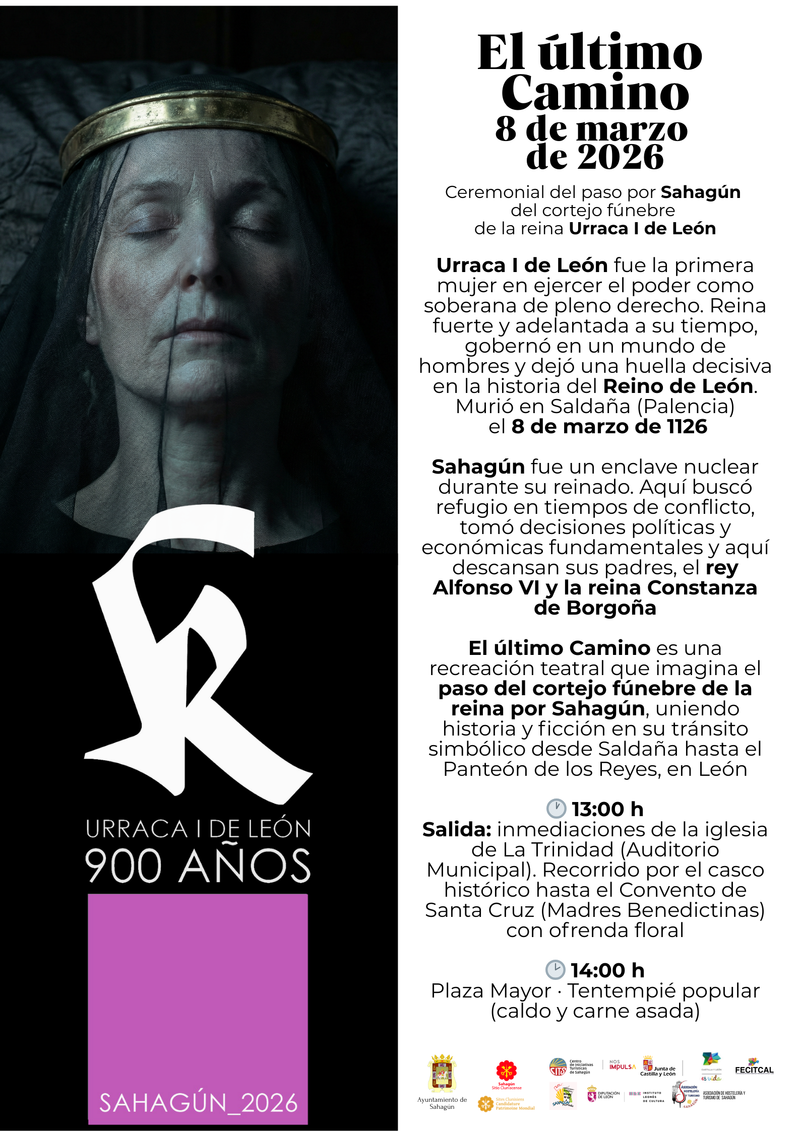Con motivo del 900 aniversario de la muerte de Urraca I, la localidad de Sahagún se acercará a revivir el traslado del cuerpo de la reina a la localidad de León, con parada en la villa donde sus padres encontraron descanso eterno. Acércate a vivirlo con nosotros. En una población declarada Conjunto Histórico, en el Camino de Santiago, volveremos al año 1126; una escenificación única. Música, atuendos, escenarios, todo, para que el 8 de marzo te sumerjas de nuevo en la Edad Media.